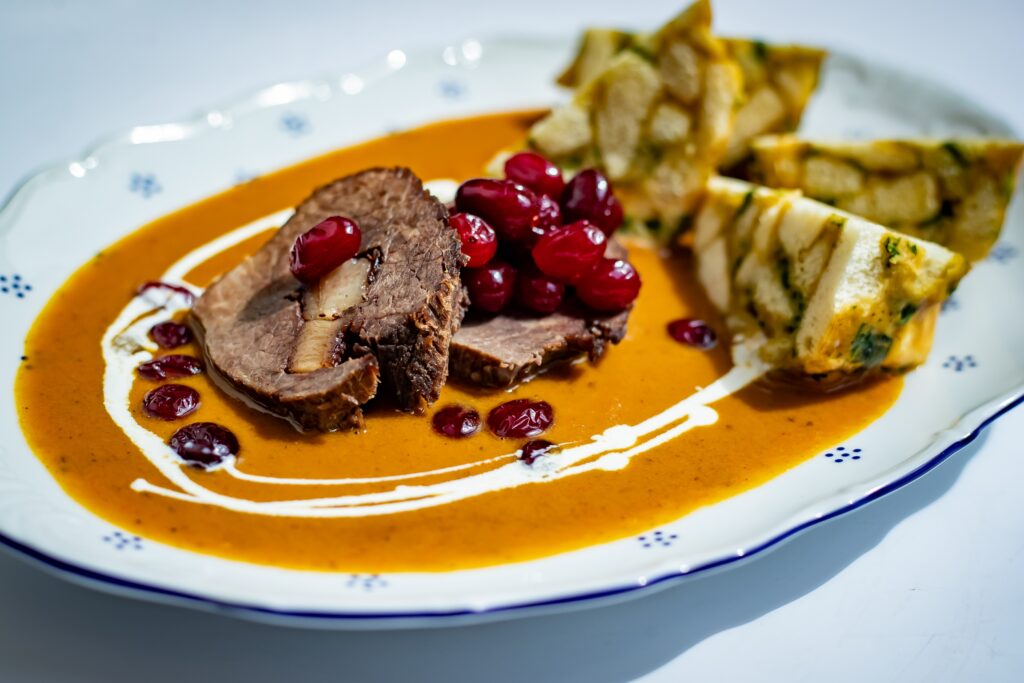 hovězí váleček, karlovarský knedlík, marinované brusinky