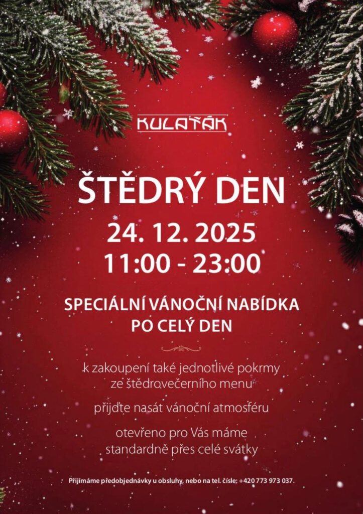 POLEDNÍ NABÍDKA Polední menu 16.12. 2025 Polévky 1) Uzená s kroupami (1,9) 53,- 2) Slepičí vývar s masem a zeleninou (9) 53,- Hlavní jídla 2) Čebavčiči (1,3,7) Mleté maso ochucené směsí koření, vařené brambory, cibulka, ajvar 166,- 2) Maďarský “Paprikáč“ (1,3,7) Dušená vepřová plec, restované papriky a houskový knedlík 174,- 3) Kuře v citronové trávě (7,9) Restované kuřecí stehenní […]